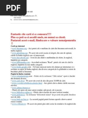 Însă accesul la informaţie este mai rapid şi nu avem nevoie să alocăm rafturi întregi... Mar 30, 2014 · cărţi de citit online. Printre beneficiile internetului se numără şi cărţile online. Ce sa le spunem copiilor. Cînd ai citit și ultima pagina din răzbunarea asasinului, nu poți să te desparți nici de erou, nici de prietenul sau lup. Aici găseşti cele mai bune surse pentru cărţi de citit în format electronic. Printre beneficiile internetului se numără şi cărţile online.