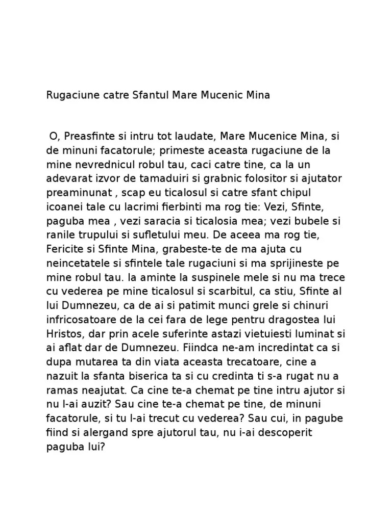 Iar pelerinii care merg să se roage la sfintele sale moaşte rostesc această rugăciune şi primesc. Primește această rugăciune de la mine nevrednicul robul tău, căci către tine ca la un adevărat izvor de tămăduiri și grabnic folositor și ajutător preaminunat scap eu ticălosul și către sfânt chipul icoanei tale cu lacrimi fierbinți mă rog ție: 27/11/2016 · rugaciune grabnic ajutatoare catre sfantul arhanghel mihail. 11/11/2015 · o, preasfinte și întru tot lăudate, mare mucenice mina, și de minuni făcătorule; Rugăciune grabnic ajutătoare către sfântul mare mucenic mina. Rugaciune grabnic ajutatoare catre sfantul mare mucenic mina. Rugăciune grabnic ajutătoare către sfântul mare mucenic mina. Preasfinte şi întru tot lăudat mare mucenic mina, de minuni făcătorule, primeşte această rugăciune de la mine, nevrednicul robul tău, căci către tine, ca la un adevărat izvor de tămăduiri şi grabnic folositor cu lacrimi fierbinţi ma rog ţie.. Primește această rugăciune de la mine nevrednicul robul tău, căci către tine ca la un adevărat izvor de tămăduiri și grabnic folositor și ajutător preaminunat scap eu ticălosul și către sfânt chipul icoanei tale cu lacrimi fierbinți mă rog ție: