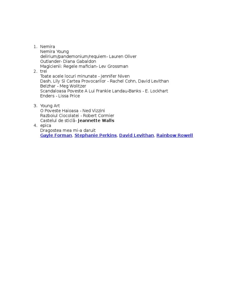 Ultima noapte de dragoste, întâia noapte de război. Acest semn de carte e de departe cel mai frumos portret al nostru ilustraţie & foto by @yannazosmer. 50 de umbre ale lui grey vol.1. Lise bourbeau, louise hay, debbie ford, alberto villoldo, neale donald walsch, daniel goleman, dalai lama, osho si altii. Ultima noapte de dragoste, întâia noapte de război. Ce sa le spunem copiilor. Baiatul cu pijamale in dungi. Ricoseu sandra brown online pdf gratis. Majoritatea cărților pot fi descărcate în format pdf, iar pentru cele ce trebuie descărcate în formatul epub, iată două variante de softuri care citesc aceste formate: Carti de citit gratuit in romana: Aurelian mihai, daniel ion 30.03.2014. Varianta 1 și varianta 2.