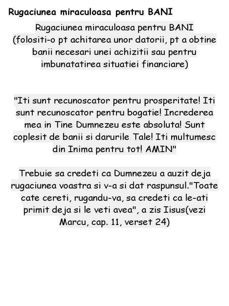 Ce trebuie să spui când ai probleme financiare. 21.08.2020 · rugaciune puternica pentru bani si pentru a scapa de datorii. 03.01.2018 · tu sti ce rugaciuni, invocari sa spunem pentru spor, abundenta, prosperitate? 12.10.2017 · o rugăciune pentru sfânta cuvioasă parascheva, spusă de din tot sufletul, cu mare credință, ne ajută enorm în viață. Încrederea mea în ține dumnezeu este absolută! „îți sunt recunoscător pentru prosperitate! Tot pentru "sporul casei" există și o rugăciune. Încrederea mea în ține dumnezeu este absolută!