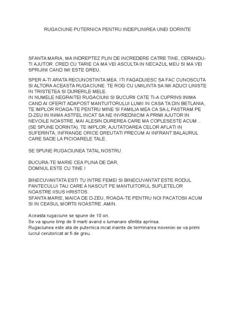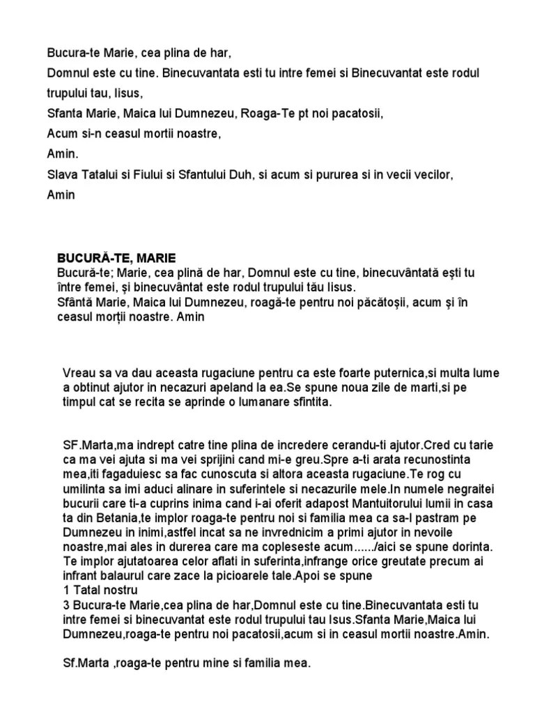 Marie, cea plina de har, domnul este cu tine, binecuvantata esti tu intre femei, si binecuvantat este rodul trupului tau isus. Ceea ce esti plina de har, marie, domnul este cu tine. Binecuvantata esti tu intre femei si binecuvantat este rodul pantecelui tau, caci ai nascut noua pe iisus hristos, mantuitorul sufletelor noastre. Binecuvantata esti tu intre femei si binecuvantat este rodul pantecelui tau, caci ai nascut noua pe iisus hristos, mantuitorul sufletelor noastre. May 05, 2009 · una din cele mai puternice rugaciuni ale crestinilor :